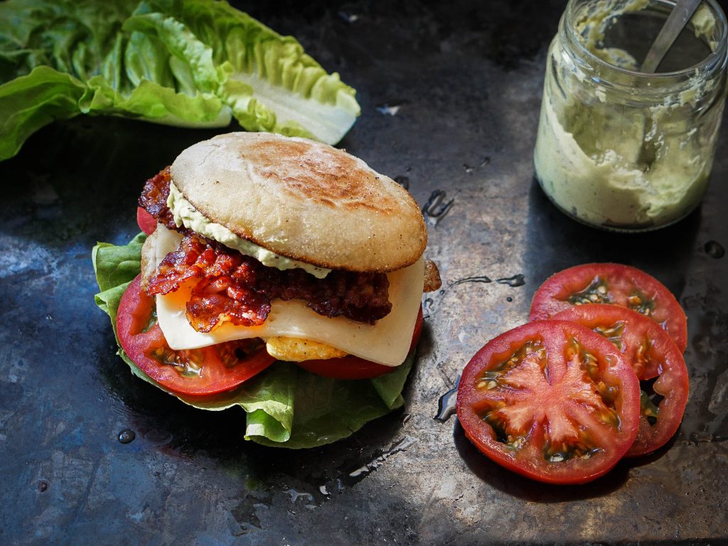 4. Add the fried eggs on top of the tomatoes. Add 3 slices of bacon and arrange evenly. Top it with some more avocado spread before putting another slice of English muffin.